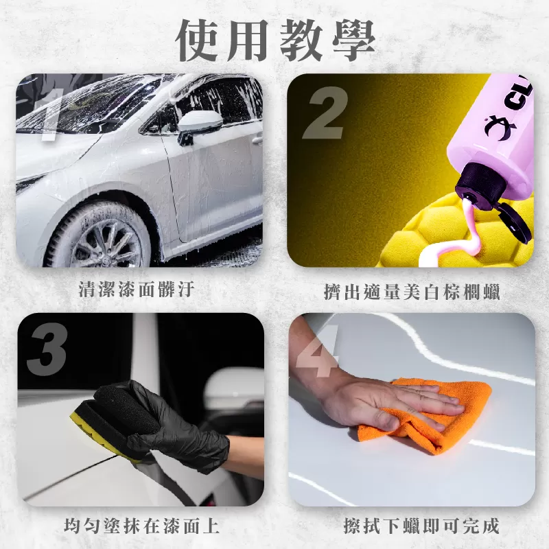 · 全車洗淨擦乾後使用海綿沾取,直接塗抹車漆表面,可搭配打蠟機施工,施工後下蠟擦乾淨即可。