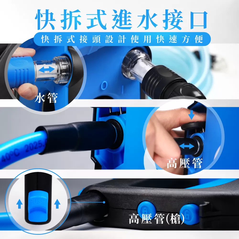 - 接上水管/水龍頭至清洗機,噴槍接上噴頭與高壓管,插上電源開啟開關,開始使用。