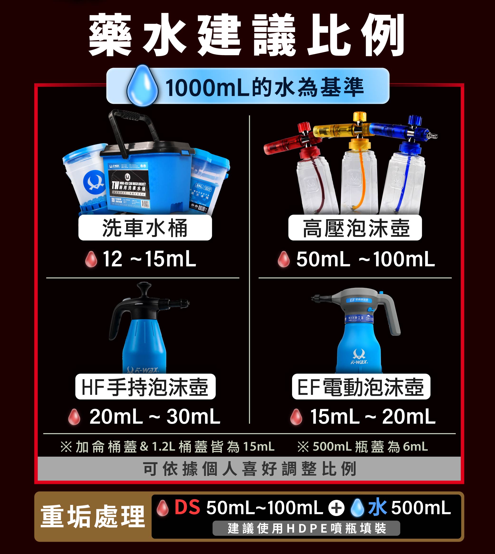 • 如為重垢,建議使用HDPE噴瓶填裝並參照以下比例,除水斑洗車精50-60mL加入水500mL。