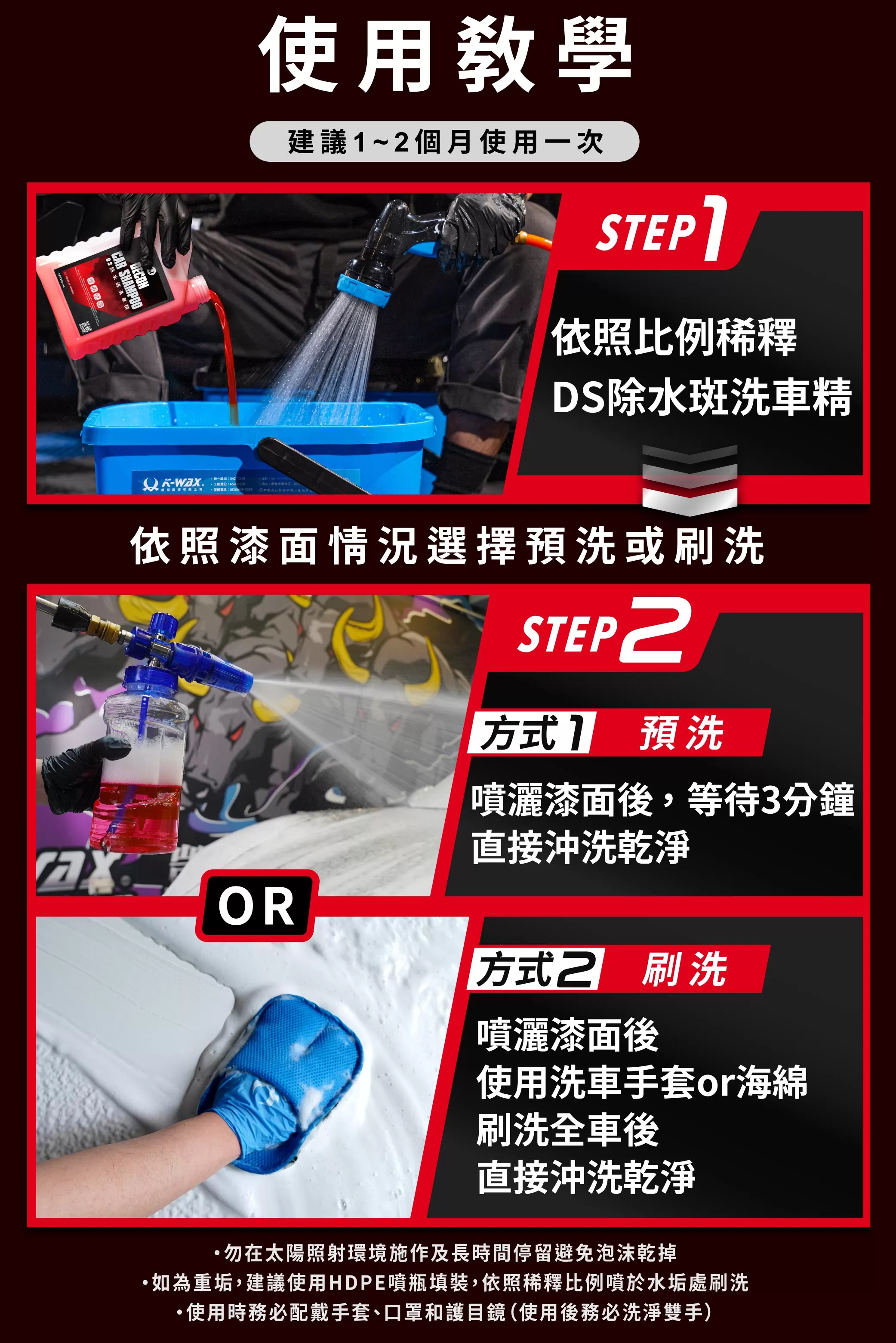• 1、預洗:噴灑漆面後,等待3分鐘,直接沖洗乾淨 | 2、刷洗:刷洗全車後,直接沖洗乾淨