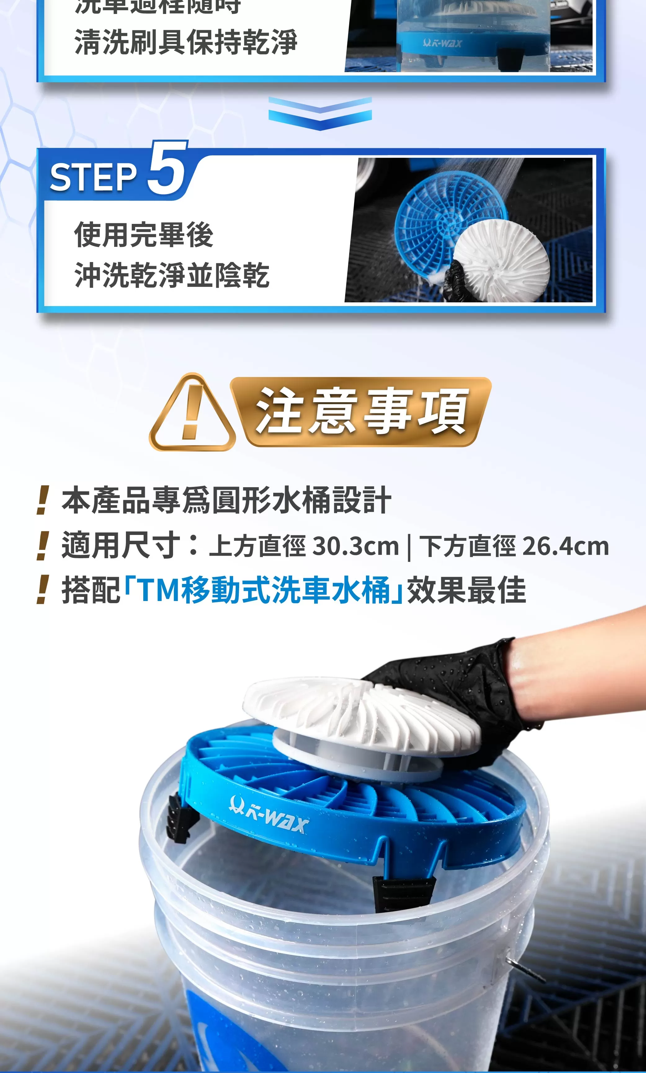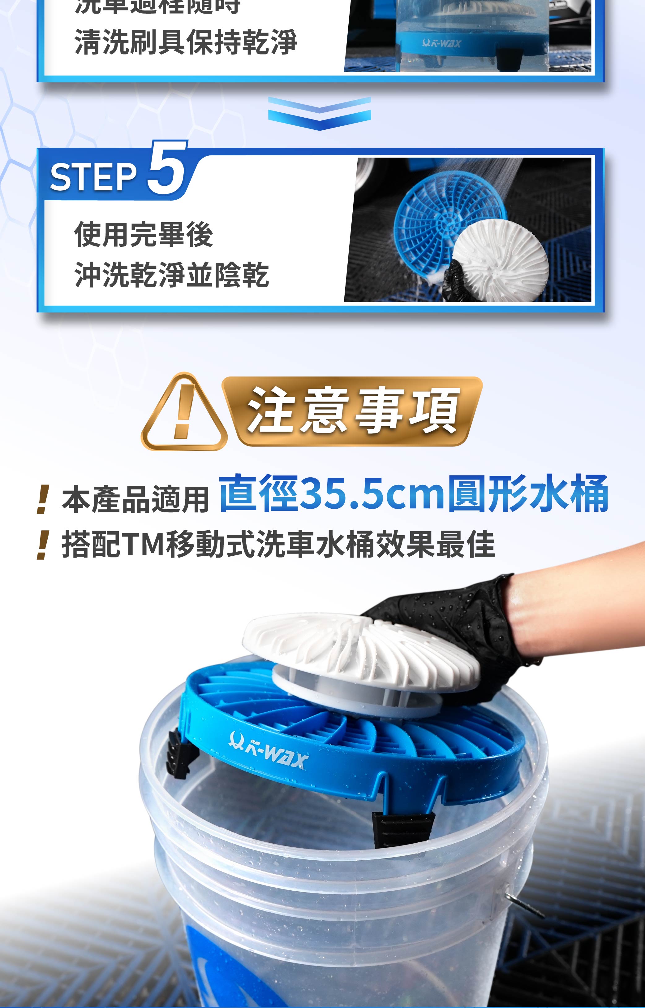 - 將本產品放入水桶底部,加入泡沫洗車精與清水即可使用