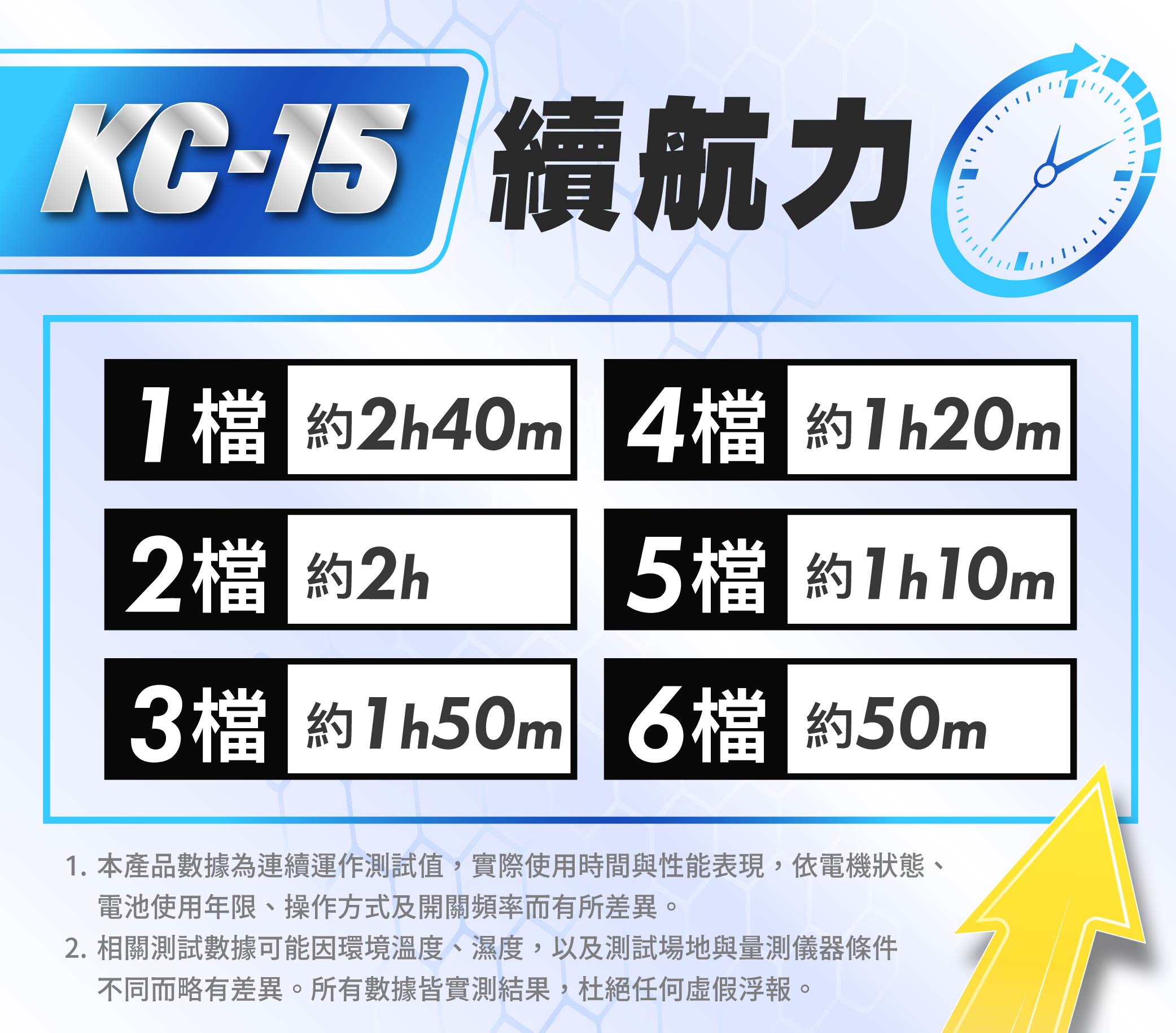 - 本產品數據為連續運作測試值,實際使用時間與性能表現,依電機狀態、電池使用年限、操作方式及開關頻率而有所差異。相關測試數據可能因環境溫度、濕度,以及測試場地與量測儀器條件不同而略有差異。所有數據皆實測結果,杜絕任何虛假浮報。