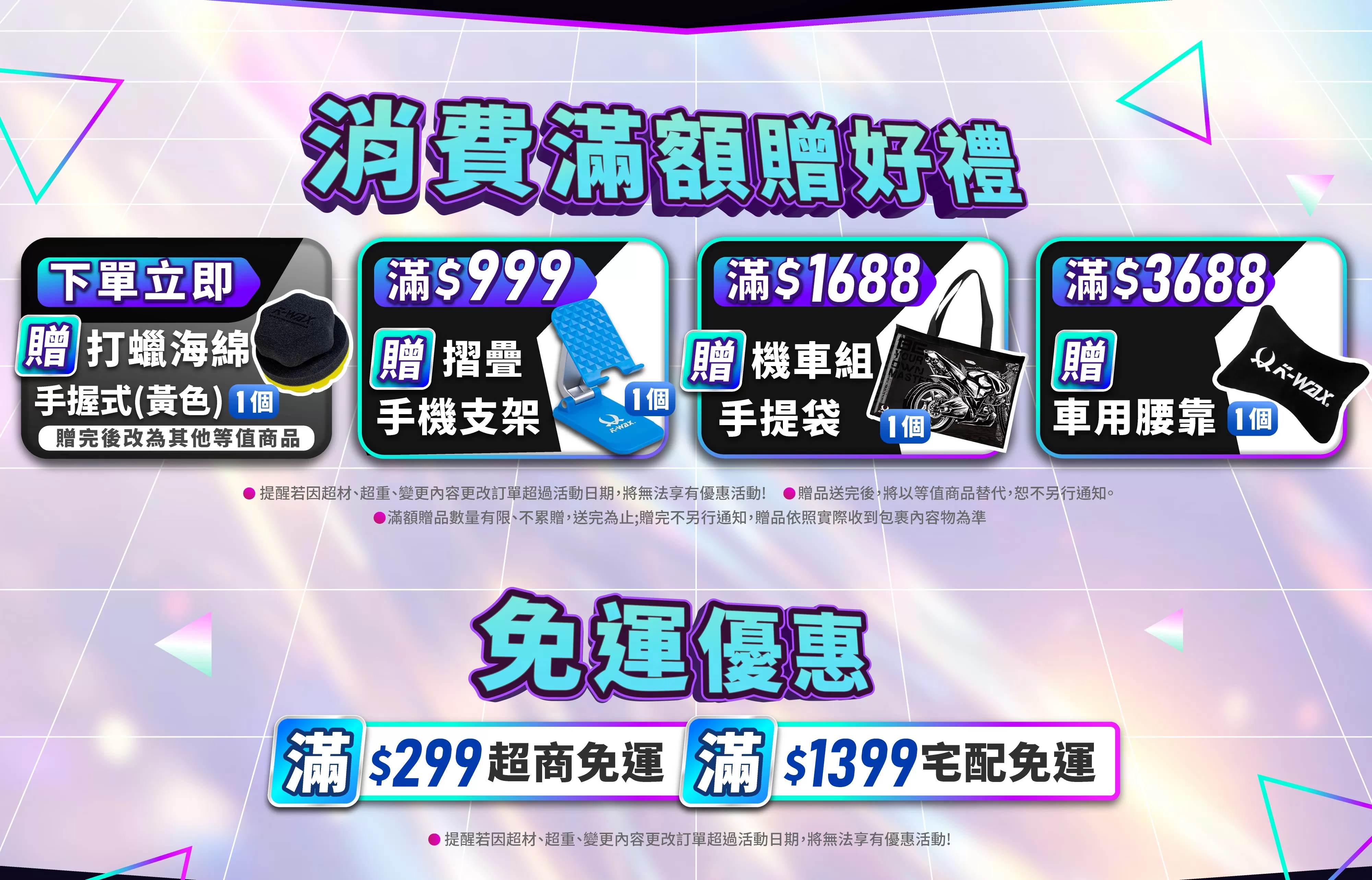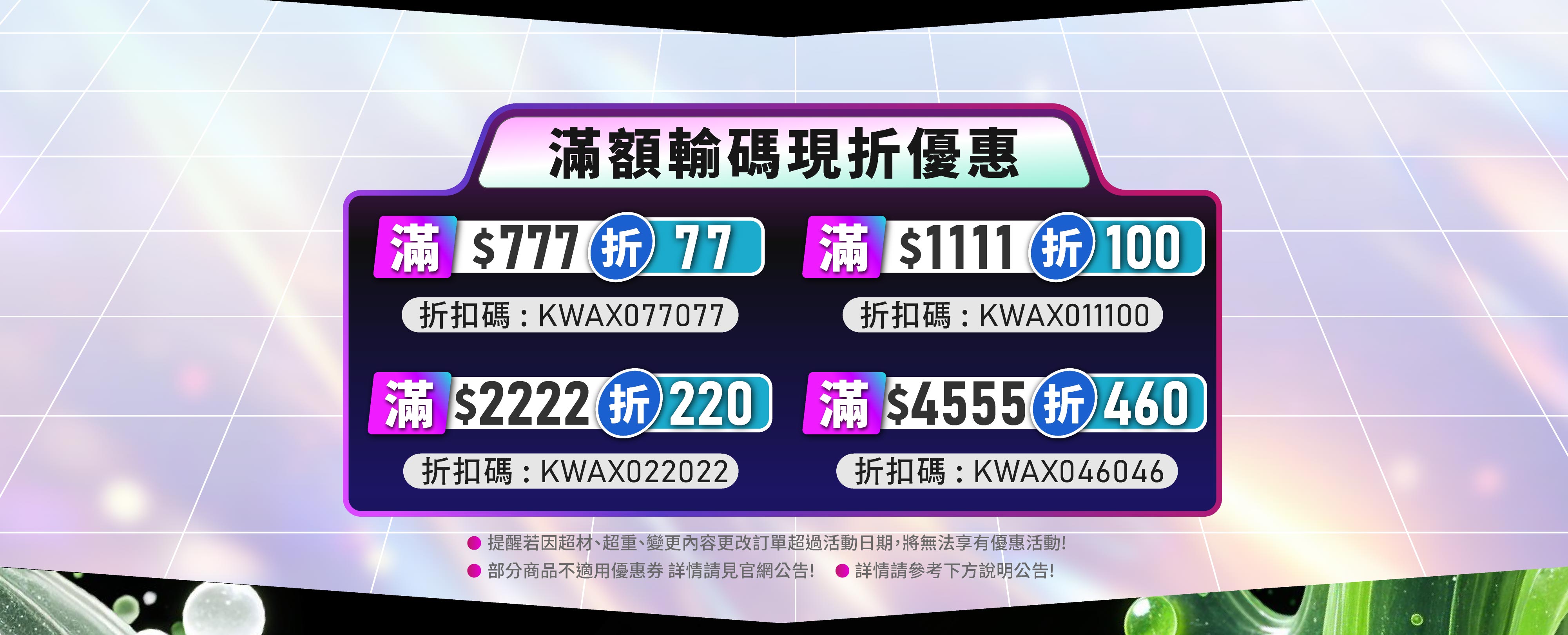 - 訂單滿額優惠、滿額贈獎、抽獎資格皆不含運費、優惠券、手續費等項目。