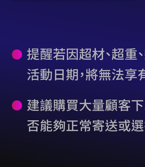 - 提醒若因超材、超重、變更內容更改訂單超過活動日期,將無法享有優惠活動!