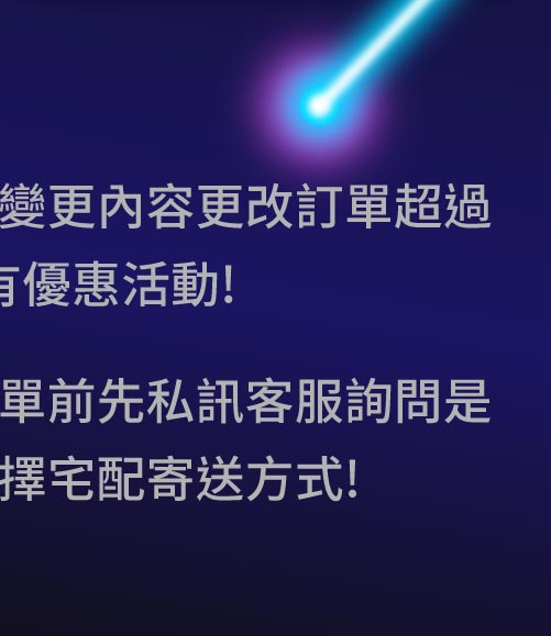 - 若因超材、超重、變更內容更改訂單超過活動日期,將無法享有優惠活動!